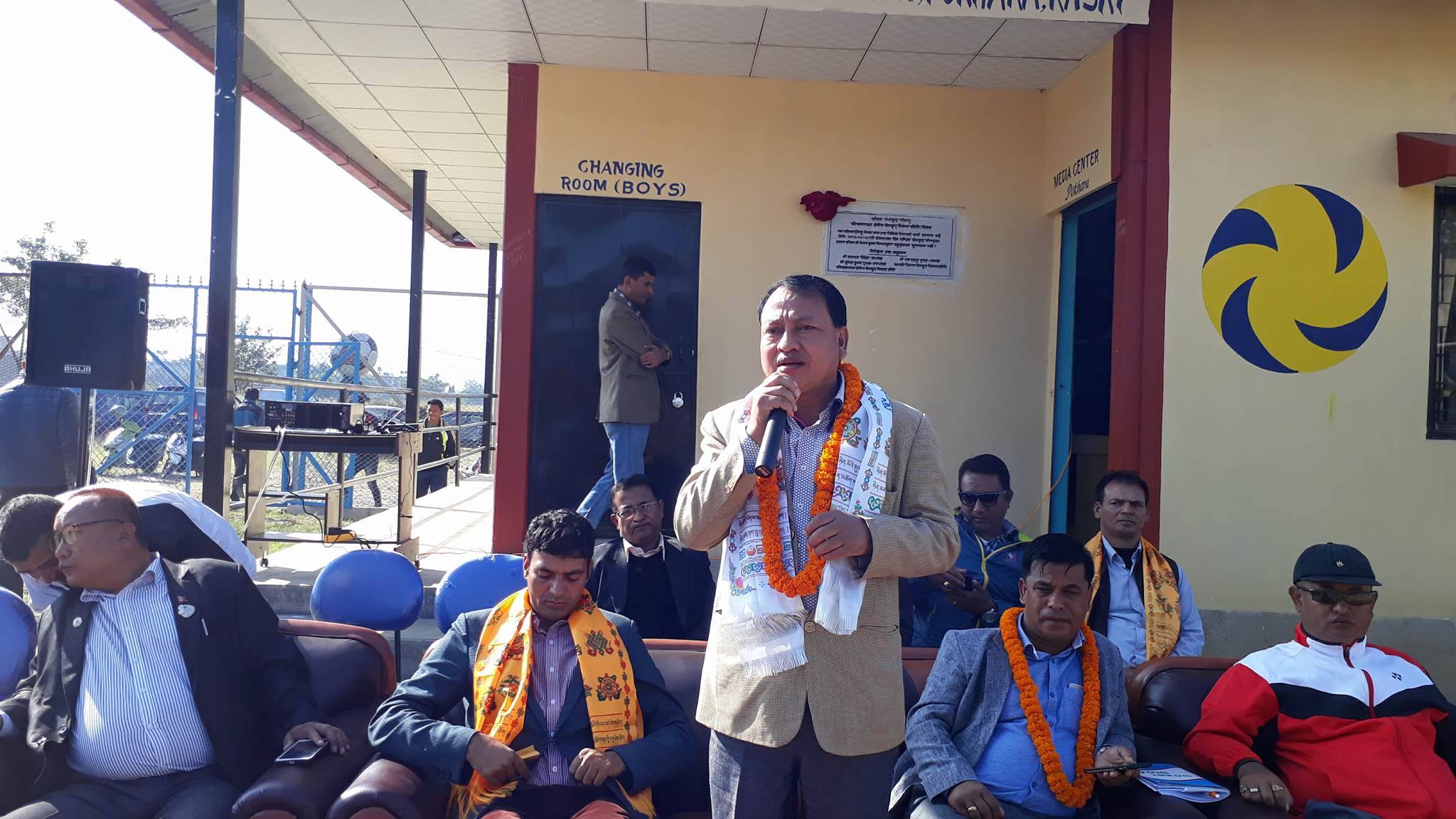 पश्चिमाञ्चल क्षेत्रीय खेलकुद विकास समितिका अध्यक्ष खगराज पौडेलले पोखरालाई खेलकुदको राजधानी बनाउन अन्तर्राष्ट्रिय स्तरको रंगशाला बनाउने खुड्किलो उक्लन सुरु भएको बताए । ‘भलिबल प्रशिक्षण केन्द्रबाट सुरु भयो । क्रिकेट, फुटबल, स्वीमिङपुल, ह्याण्डबल, एथ्लेटिक्स ट्रयाक, मार्सल आर्टस्का सम्पूर्ण विधालाई समेट्दै तल्लो भागको स्केटिङसम्म पुग्नेछौं’ उनले भने– ‘अब पोखरामा फेवाताल, माछापुच्छ«े मात्र हुने छैनन् । गौरवलायक नमुना रंगशाला हामीमाझ हुनेछ ।’ उनले पूर्वाधार भएमात्र पदकको आश गर्न सकिने भएकाले अब पदक प्राप्त गर्ने दिन टाढा नभएको बताए । यस्तै, भलिबल कोर्टमा फाईवर विछ्याएर सागको वामअर्प गर्न पोखरा आउन सक्ने वातावरण तयार हुने गरी अघि बढेको जनाए ।