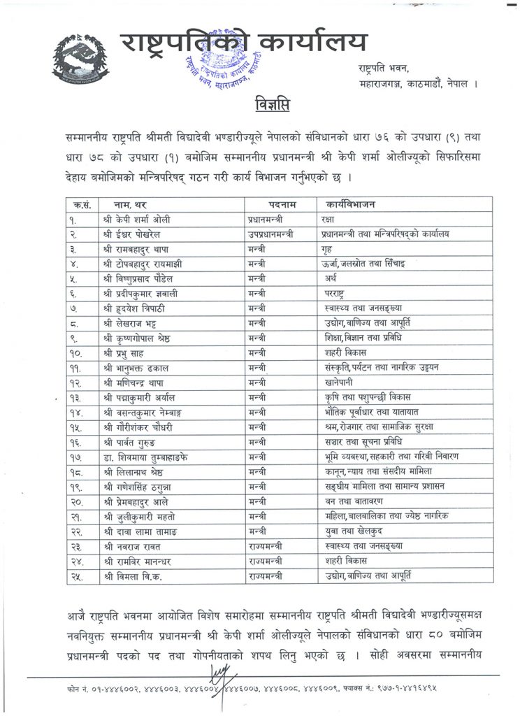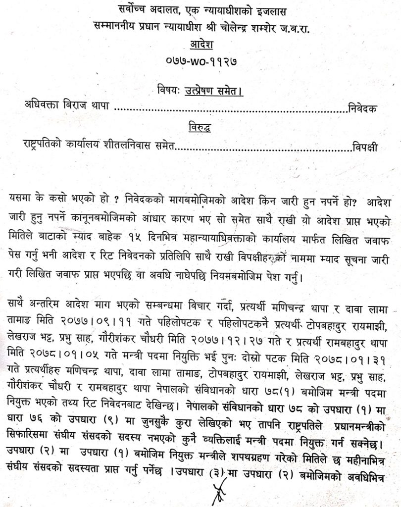 युक्ति बदर गर्ने आदेश दिएको छ। सांसद पद खारेज भएपछि पनि प्रधानमन्त्री केपी शर्मा ओलीको पछिल्लो मन्त्रिपरिषद्मा सातजना मन्त्रीको निरन्तरतालाई असंवैधानिक ठहर गर्दै सर्वोच्च अदालतले उनीहरूलाइ पदमुक्त गरेको हो ।